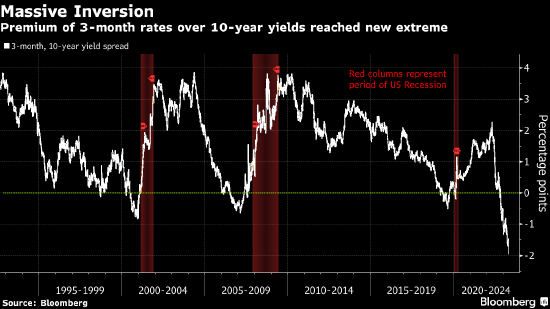 3个月期国库券收益率升至5.25%以上,周四较10年期国债收益率之差一度触及约2个百分点,创下1992年彭博搜集该数据以来的最高水平。