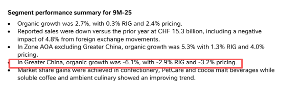 从经营质量指标来看,大中华区的表现同样不尽如人意。2025年前9个月,雀巢大中华区的有机增长率为-6.1%,其中实际内部增长率为-2.9%,定价贡献率为-3.2%,多项指标在半年报的基础上进一步恶化。也就是说,在大中华市场,雀巢即使降低价格也未能阻止销量下滑,反映其产品或渠道策略可能未能有效适应市场变化。