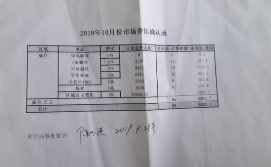 多位雀巢分销商向《BUG》栏目提供了费用确认函、对账单等资料,并指出资料上有雀巢当地办事处主管的签名。分销商同时反映,由于当地办事处人员变动频繁,导致欠款问题最终无人跟进。李明也补充称,很多业务员面对遗留欠款问题无力解决,只能频繁换人。