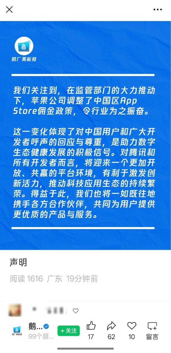 以下为腾讯公司回应全文:我们关注到,在监管部门的大力推动下,苹果公司调整了中国区App Store佣金政策,令行业为之振奋。这一变化体现了对中国用户和广大开发者呼声的回应与尊重,是助力数字生态健康发展的积极信号。对腾讯和所有开发者而言,将迎来一个更加开放、共赢的平台环境,有利于激发创新活力,推动科技应用生态的持续繁荣。得益于此,我们也将一如既往地携手各方合作伙伴,共同为用户提供更优质的产品与服务。