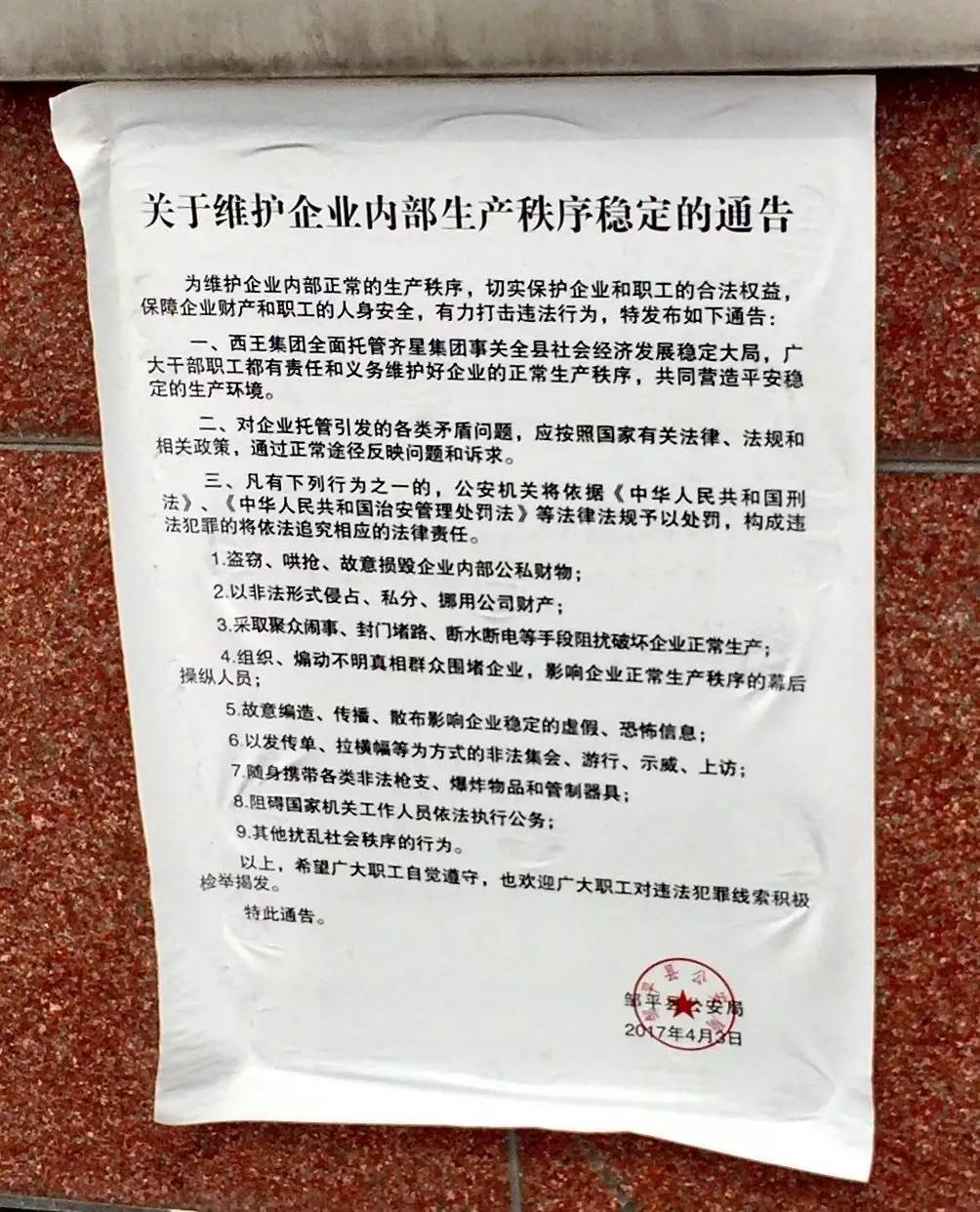 一张贴在总部门口的通告用词颇为严厉:西王集团全面托管齐星集团事关全县社会经济发展稳定大局,广大干部职工都有责任和义务维护好企业的正常生产秩序。凡有盗抢、哄抢、故意损毁企业内部公司财物;以非法形式侵占私分、挪用公司财产的行为,公安机关将依据有关规定予以处罚。该通告落款为邹平县公安局。