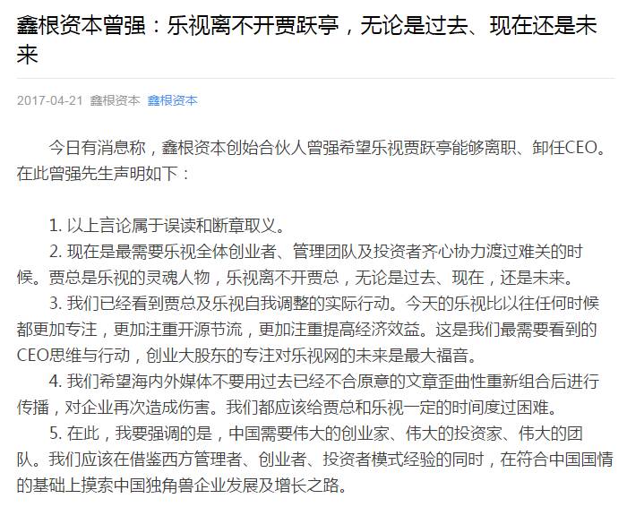 随后,鑫根资本创始合伙人曾强向媒体回应称,乐视离不开贾跃亭,“希望海内外媒体不要用过去已经不合原意的文章重新组合”,给乐视时间度过最困难的时期。