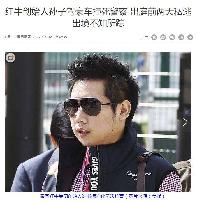 据美联社今年3月报道,2012年9月3日,红牛集团创始人许书标的孙子沃拉育驾驶一辆法拉利肇事逃逸,被他撞死的是一名泰国警察,尸体被弃置在曼谷一条街上,几个小时后才被发现。