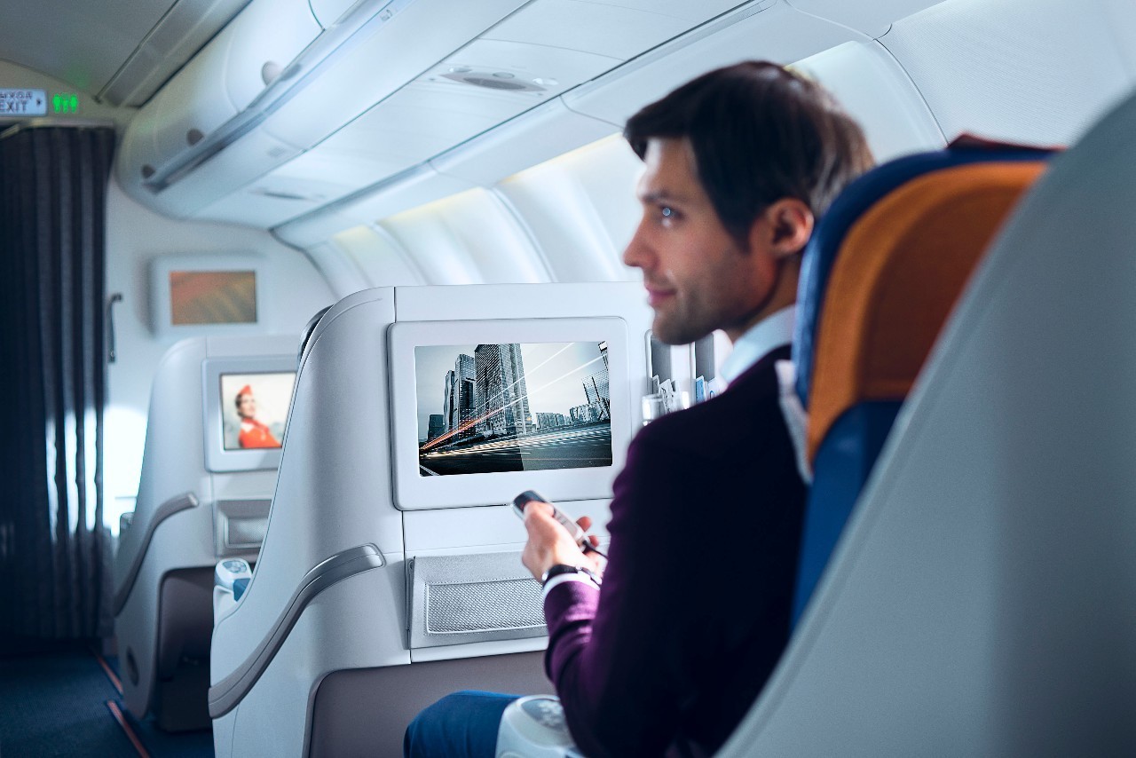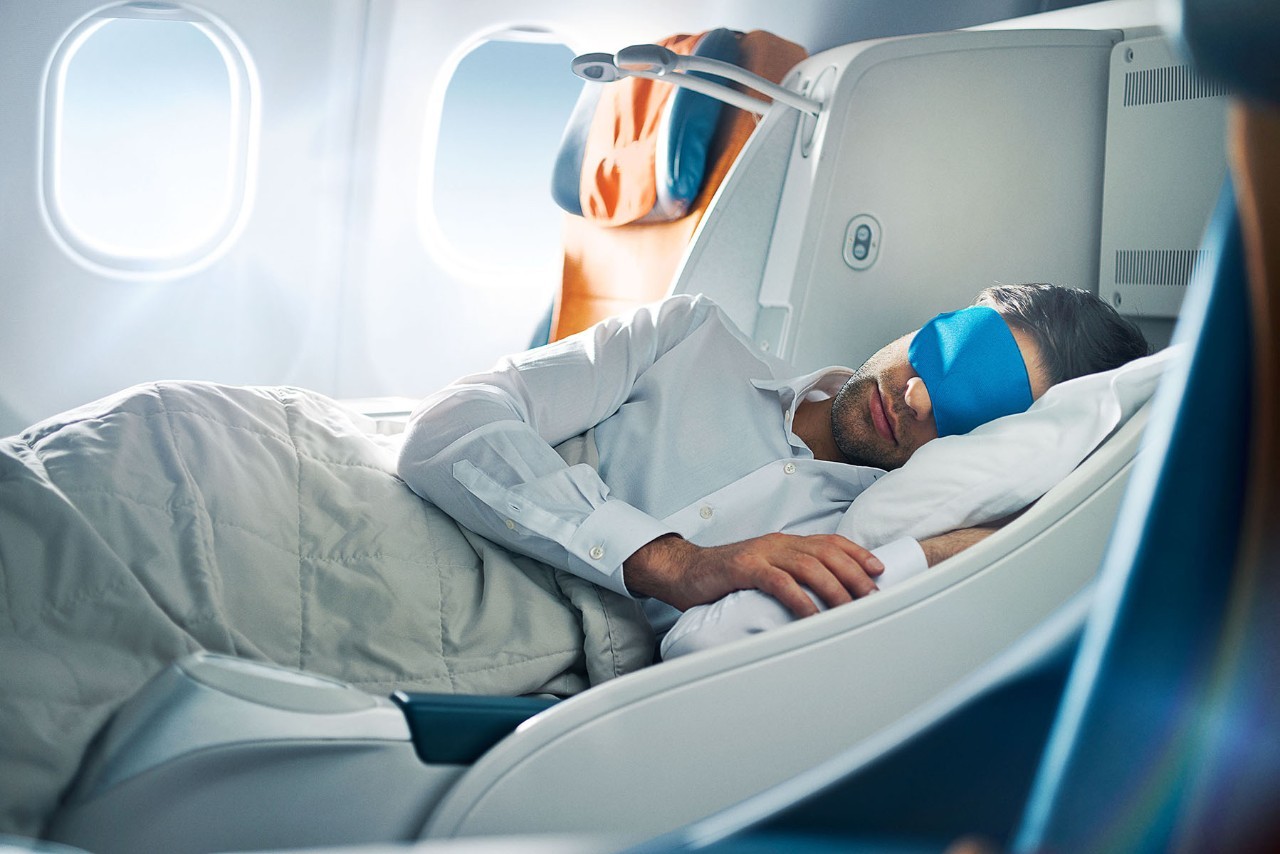 公务舱全部使用可任意调节椅背角度直至全平躺的座椅(座椅间距为153cm,展开长度195cm,宽度68cm,仰角180度),满足不同坐姿及睡姿的乘客。宽大的椅背后侧还附有阅读灯及耳机插口,夜幕降临后你也有属于自己的私人空间。