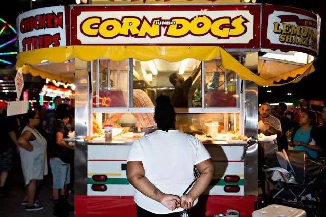一名嘉年华的参与者站在特许经营的玉米热狗店旁。