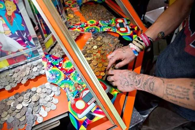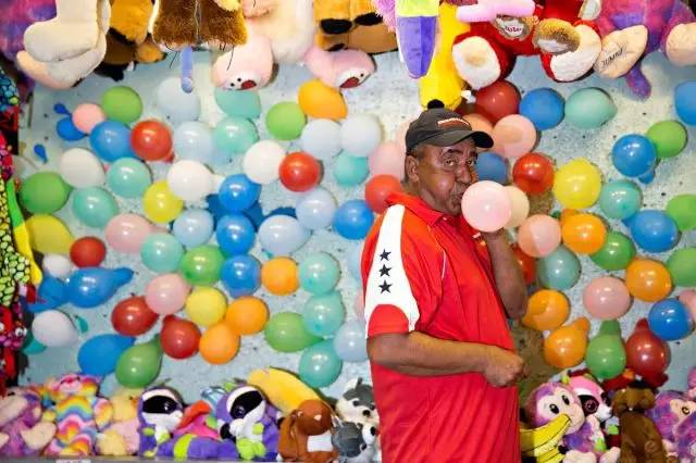 在倒班之前,游戏设施的操作员耶利米·德尔莫(Jerimiah Delorme)正在整理游戏机里的硬币。