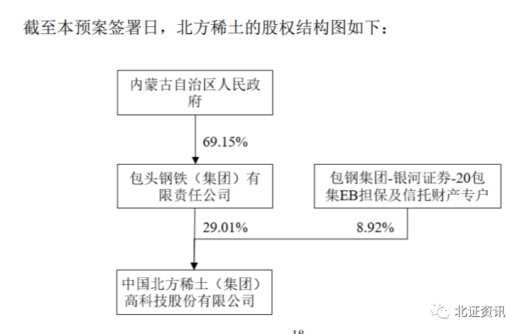 公告显示,截至预案签署日,北方稀土持有包钢节能100%股权,为包钢节能控股股东。包钢集团直接持有北方稀土29.01%股份,通过“包钢集团-银河证券-20包集EB担保及信托财产专户”持有北方稀土8.92%股份,合计持有北方稀土37.93%股份,为北方稀土控股股东;内蒙古自治区人民政府持有包钢集团69.15%股份,为包钢集团实际控制人。因此,包钢节能的实际控制人为内蒙古人民政府。