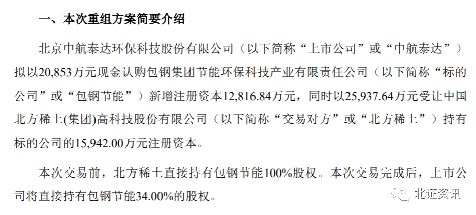 根据公告,中航泰达拟以20,853万元认购包钢节能新增注册资本12,816.84万元,同时以25,937.64万元受让北方稀土持有包钢节能的15,942.00万元注册资本。本次交易前,北方稀土持有包钢节能100%股权;本次交易完成后,中航泰达将持有包钢节能34%的股权,本次交易构成重大资产重组。而北方稀土并没有丧失对包钢节能的控制权,包钢节能仍将纳入北方稀土的合并报表范围。