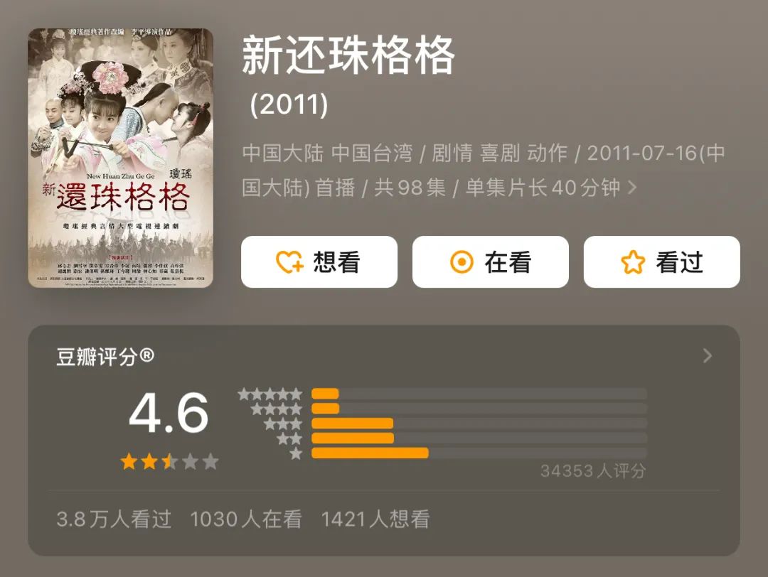 且在豆瓣电影上,相较于老版《还珠格格》评分最高达8.5分的表现,《新还珠格格》的评分仅为4.6分。