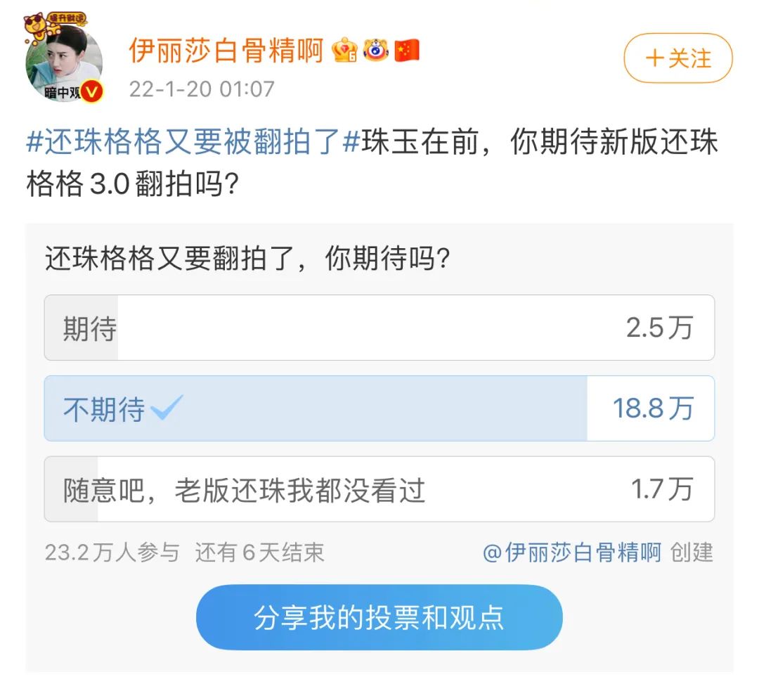 据微博话题下的投票数据显示,针对“还珠格格又要翻拍了,你期待吗”的问题,截至北京商报记者发稿时,已有超23万人参与,“不期待”这一选项则已有超18万人投票,占比超过了八成。