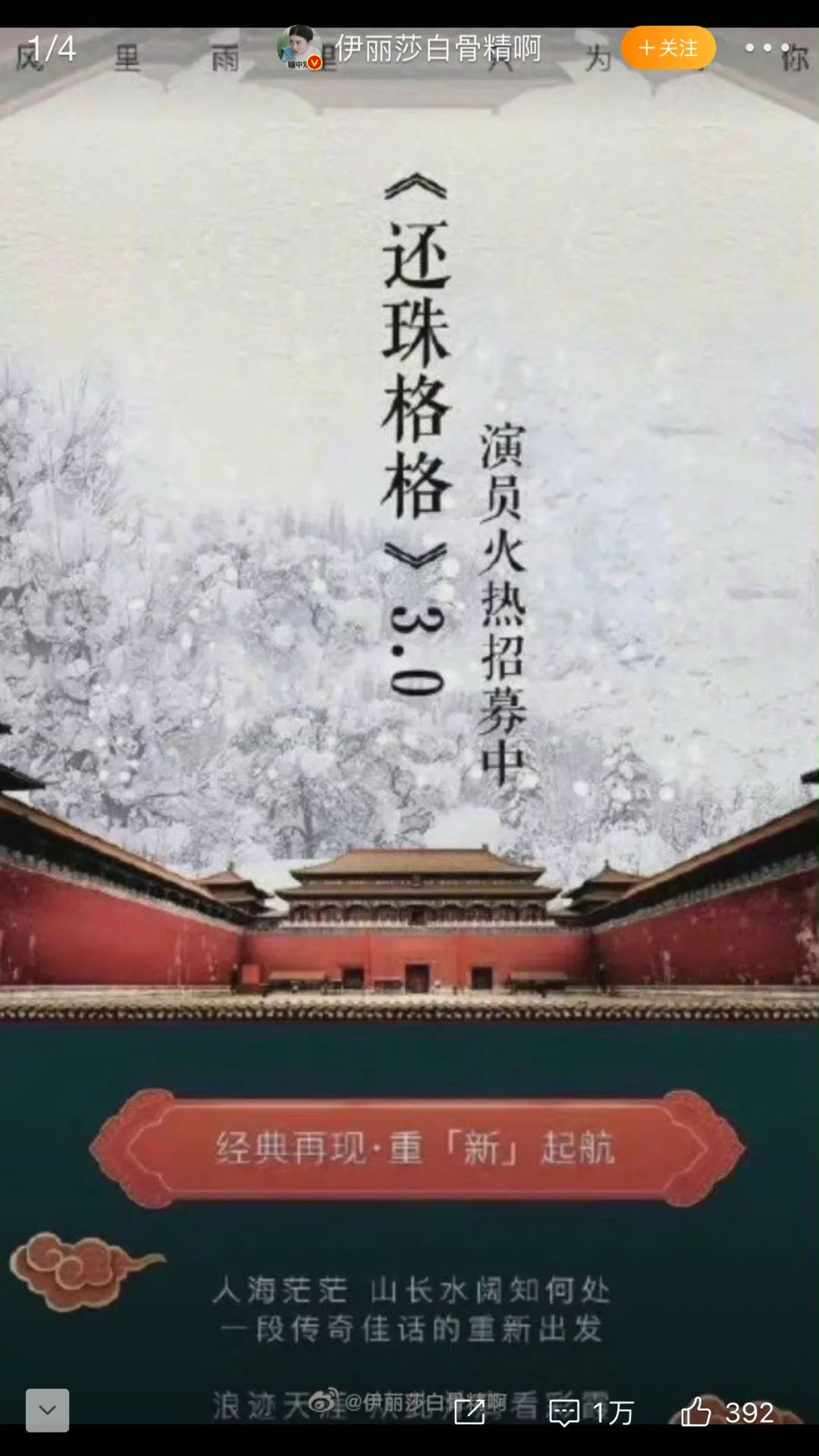1月20日,一条“还珠格格又要被翻拍了”的话题登上微博热搜,“《还珠格格》3.0演员火热招募中”的文字也被醒目标注在网友曝光的图片正中央。
