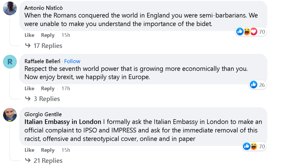 一位叫Giorgio Gentile的意大利网民更表示他已经联系了意大利驻英国伦敦的大使馆,希望后者就此事向英国方面提出抗议,移除《经济学人》这篇种族主义的、冒犯性的和偏见性的封面图。