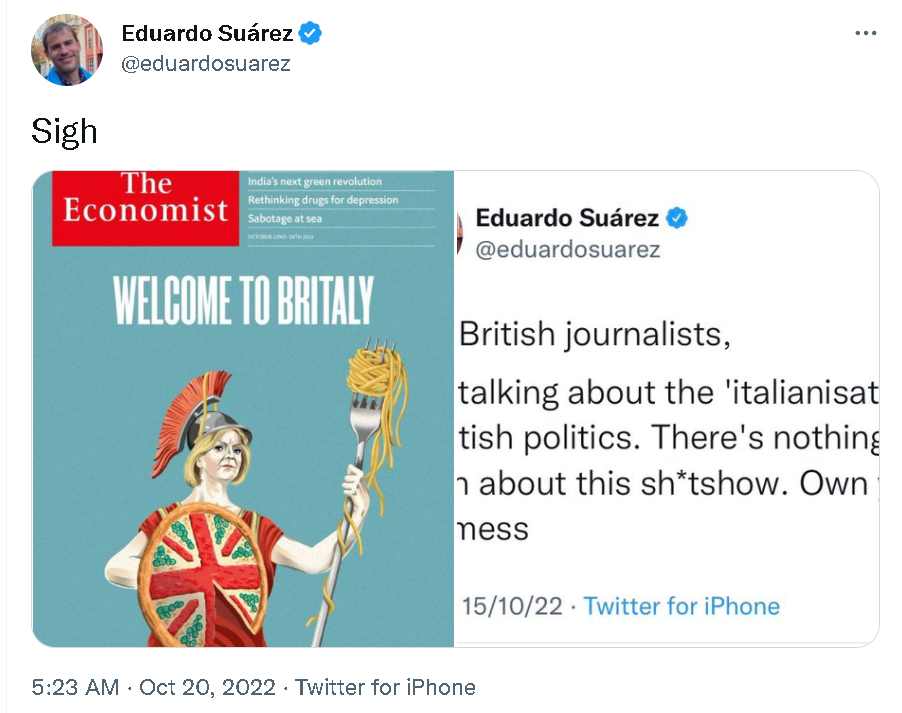 另一位名叫Educardo Suarez的记者则重新转发了一则他在10月15日就发表过的帖文,其内容是:亲爱的英国记者,别再谈论什么英国政治的“意大利化”了。英国现在的“狗屎局”可不是意大利特色的,管好你们自己吧。
