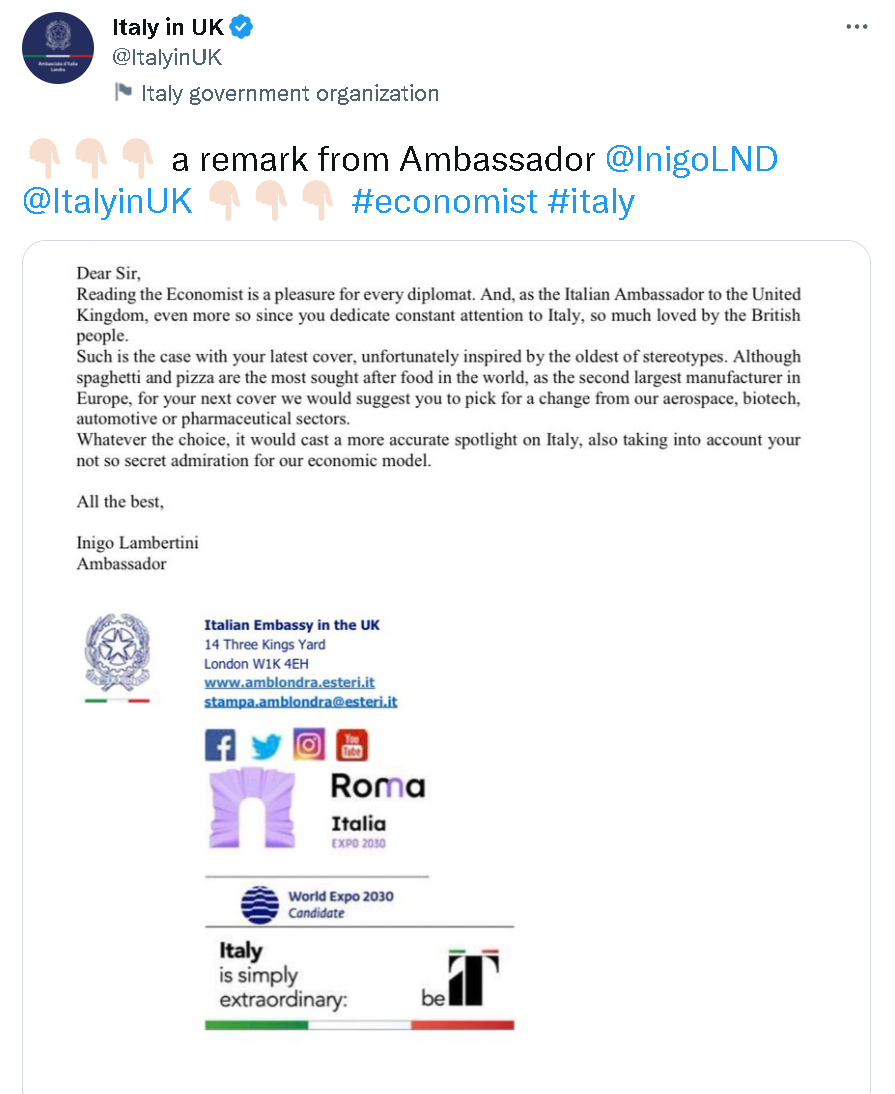 实际上,意大利驻英国大使馆也确实对此事表达了不满。在一份发表在社交网站上的声明中,意大利驻英国大使馆也是“嘲讽力”全开,先是阴阳怪气地对英国《经济学人》持续关心意大利表示了感谢,然后表示意大利的面条和披萨饼虽然是全世界最受欢迎的食物,但意大利作为欧洲第二大的制造国,同时还有航天科技、生物科技、制药业和汽车制造业,《经济学人》应该更准确地介绍英国,而不是像这起报道封面那样玩弄对意大利古老的刻板偏见。