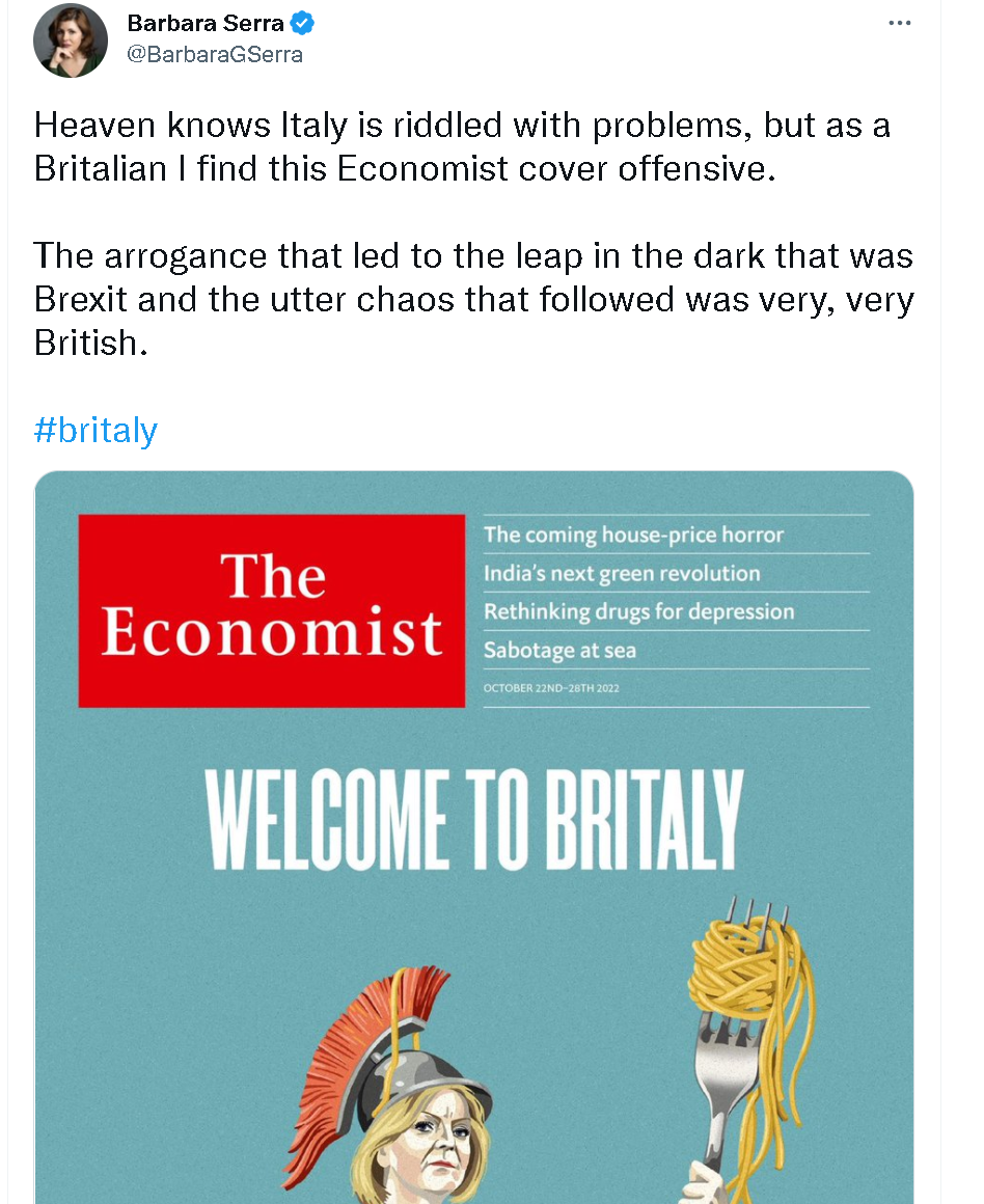 可就在特拉斯辞职前几个小时,英国媒体《经济学人》却因为一篇报道引起了意大利人的强烈不满。因为这篇报道虽然讲述的是英国当前的政治困境,却把人家意大利给扯了进来,说什么英国政治正在“意大利化”。