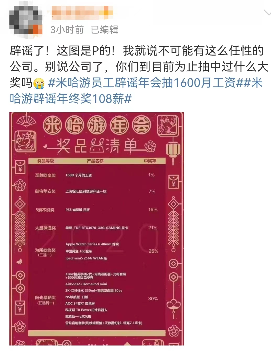 米哈游辟谣“年终奖发108薪”
