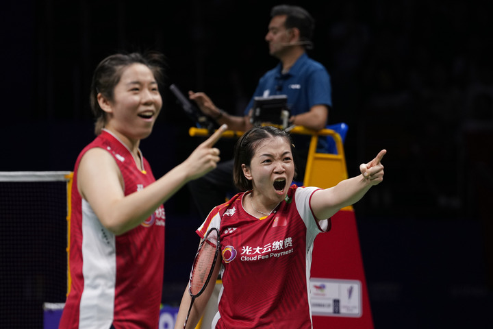 5月20日,中国队组合陈清晨(右)/贾一凡在女双比赛后庆祝,她们以2比0战胜日本队组合福岛由纪/广田彩花。新华社记者 李博 摄