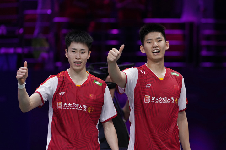 5月20日,中国队组合刘雨辰(右)/欧烜屹在男双比赛后庆祝,他们以2比1战胜日本队组合保木卓朗/小林优吾。新华社记者 李博 摄
