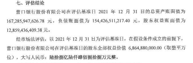 根据营口银行评估报告显示,截至2021年12月31日,该行总资产为1672.86亿,股东权益为128.59亿,评估值为68.65亿。
