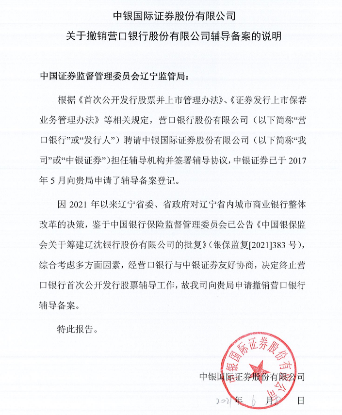 不过在2021年6月,中银国际撤销了营口银行上市发行股票的辅导工作,原因是辽宁省内城商行整体改革,筹建辽沈银行。
