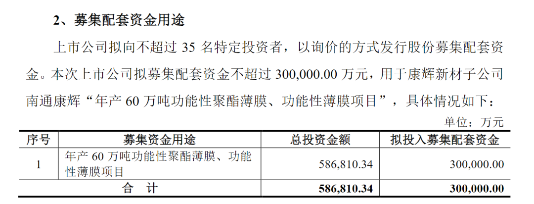 最后是募集配套资金,上市公司拟向不超过35名特定投资者,以询价的方式发行股份募集配套资金。本次上市公司拟募集配套资金不超过30亿元,用于康辉新材子公司南通康辉“年产60万吨功能性聚酯薄膜、功能性薄膜项目”。