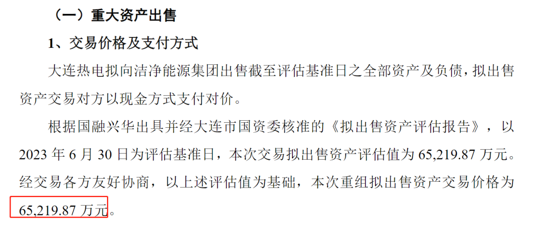 首先是重大资产出售,大连热电拟向洁净能源集团出售全部资产及负债,本次重组拟出售资产交易价格为6.52亿元。