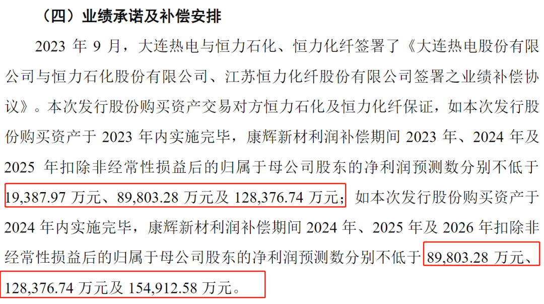除了上述超百亿的作价,本次康辉新材的业绩承诺也颇有看点。交易对方恒力石化及恒力化纤保证,如本次发行股份购买资产于2023年内实施完毕,康辉新材利润补偿期间2023年、2024年及2025年扣除非经常性损益后的归属于母公司股东的净利润预测数分别不低于1.94亿元、8.98亿元及12.84亿元。