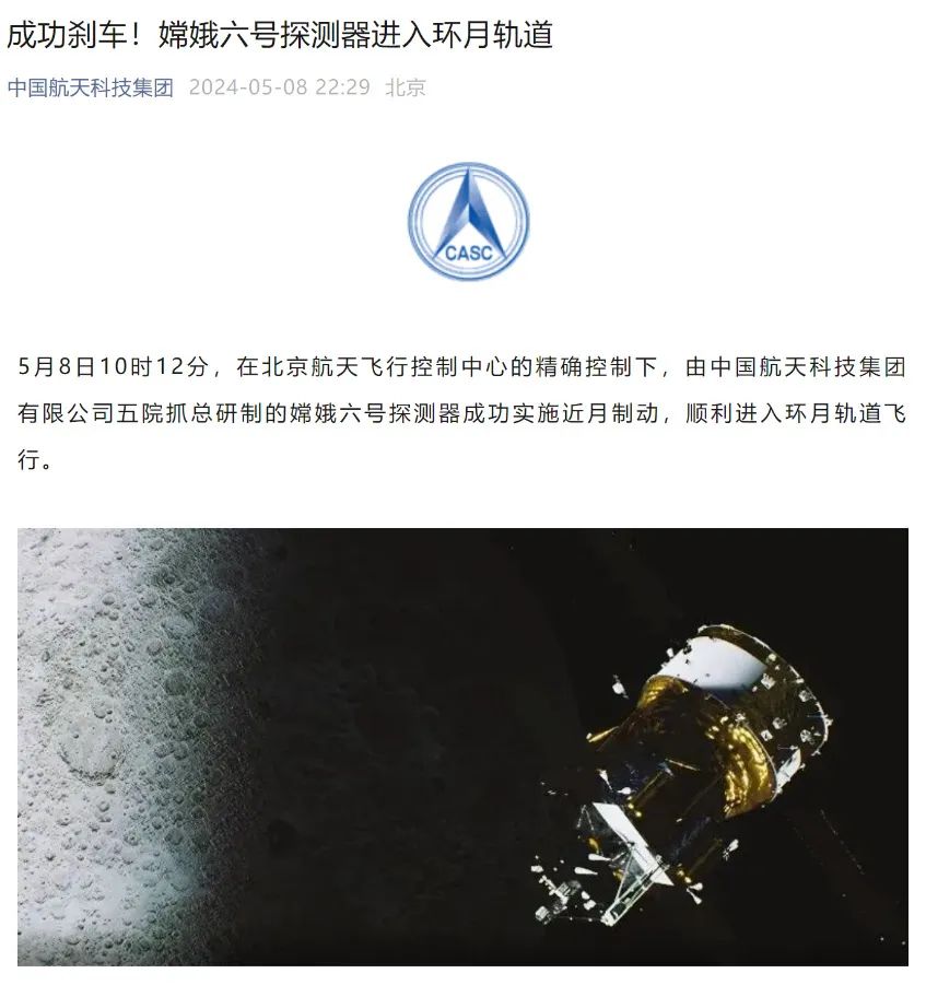 此外,探月工程方面,5月8日10时12分,在北京航天飞行控制中心的精确控制下,由中国航天科技集团有限公司五院抓总研制的嫦娥六号探测器成功实施近月制动,顺利进入环月轨道飞行。5月3日,嫦娥六号探测器发射成功。