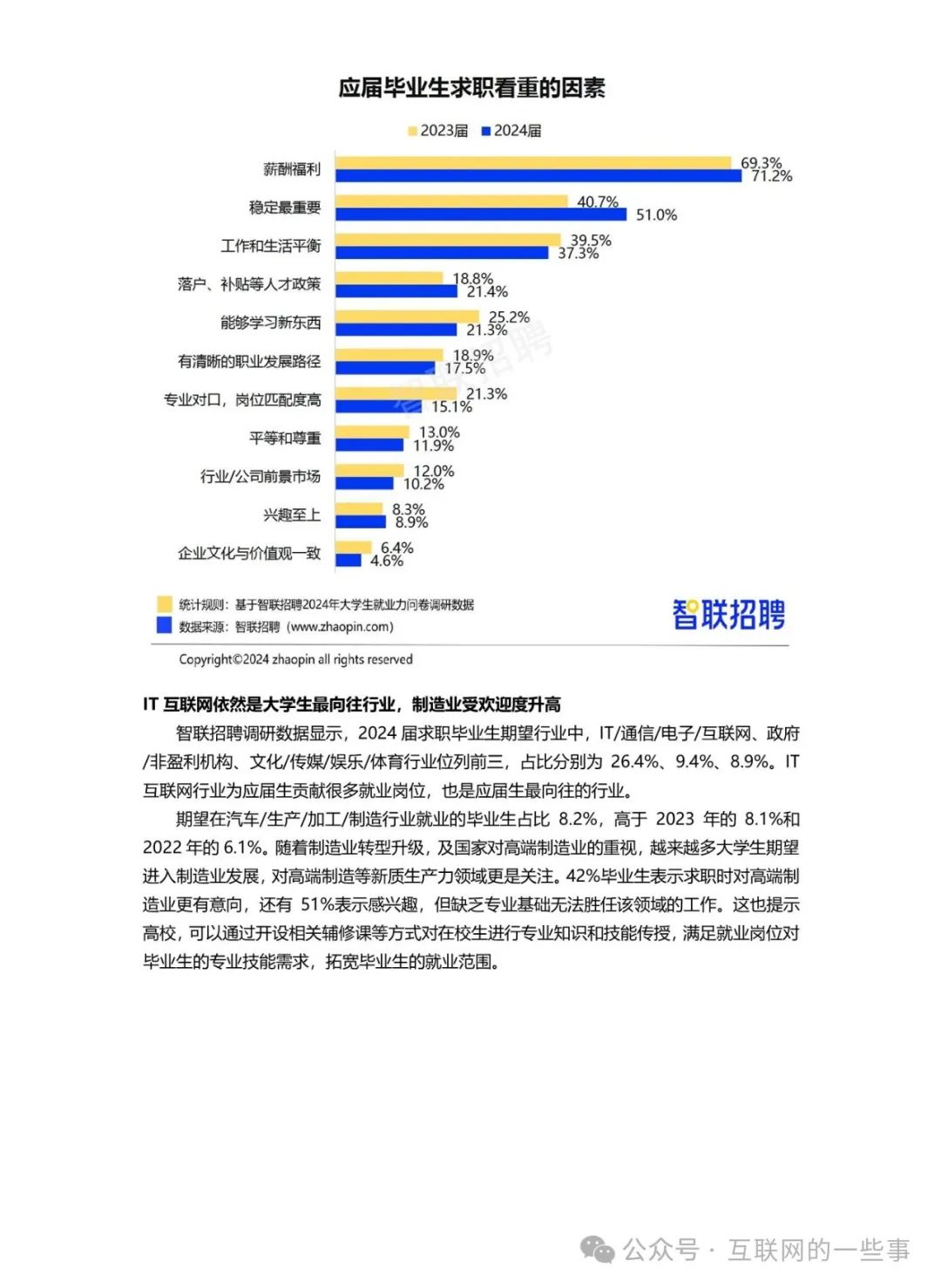 在就业偏好方面,国企成为大多数毕业生的首选,48%的应届生希望进入国企工作,体现了毕业生对工作稳定性的高度重视。IT互联网行业依然是大学生最向往的行业,同时制造业的受欢迎度也在升高。