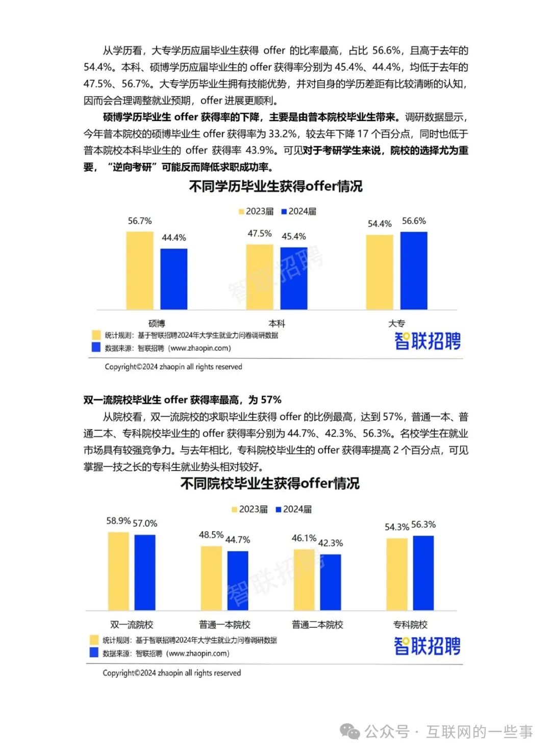 求职进展总体平稳,48%的求职毕业生获得offer,其中大专生获得offer的比例最高,为56.6%。双一流院校毕业生的offer获得率最高,达到57%。
