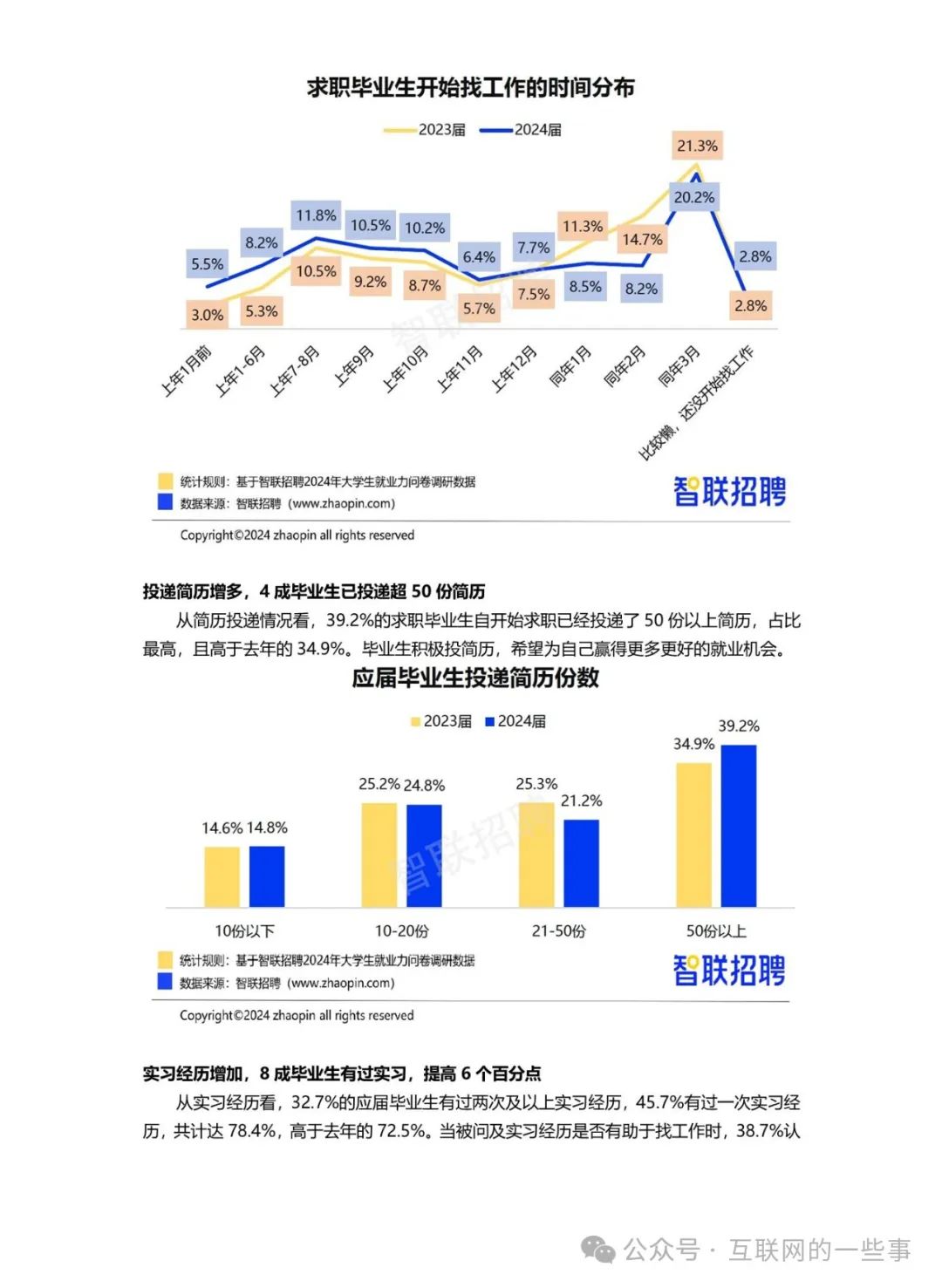 求职行为方面,毕业生更加积极,60.3%的毕业生在大四上学期或更早开始寻找工作,39.2%的毕业生已投递超过50份简历,8成毕业生有过实习经历。
