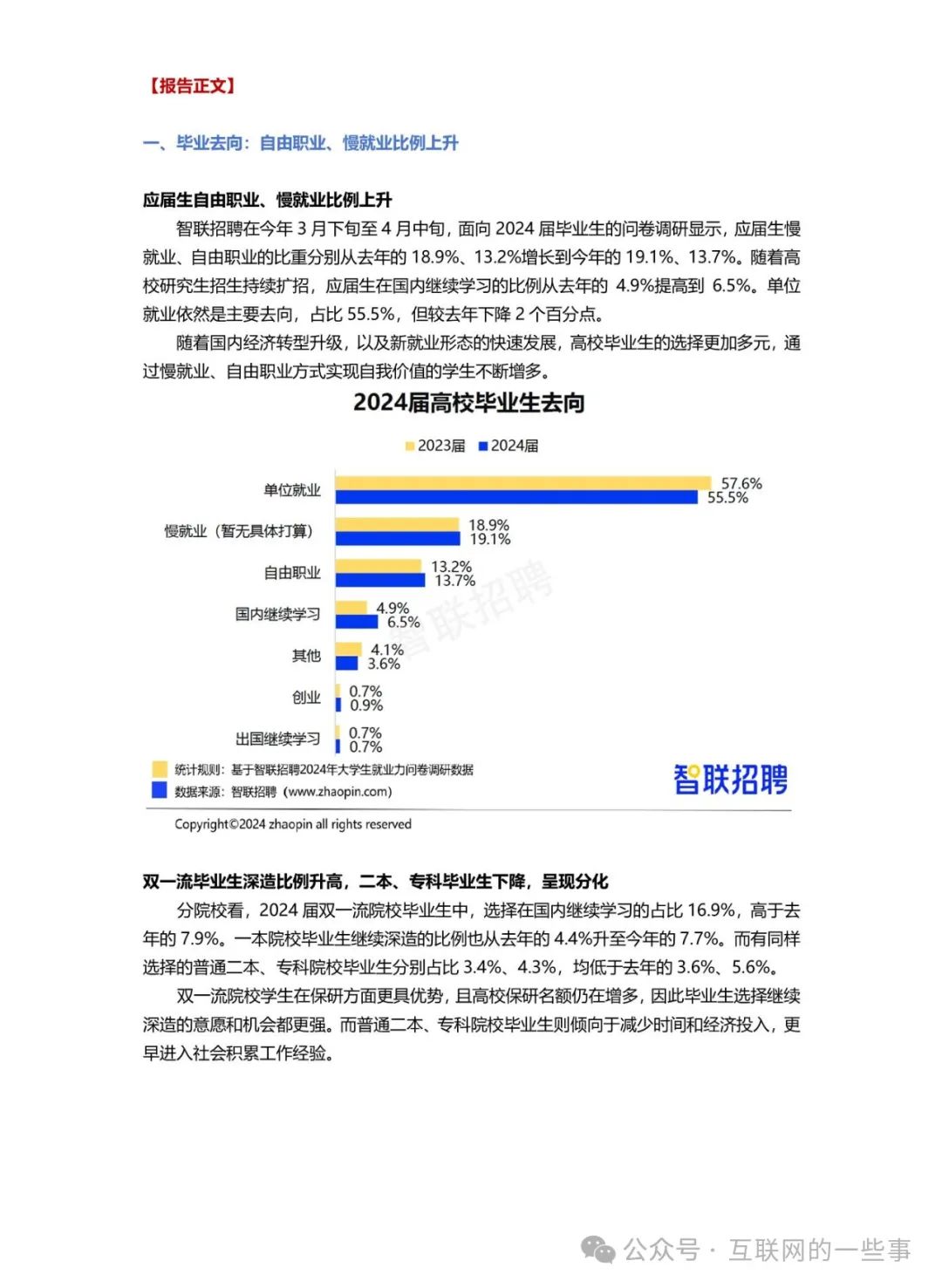 智联招聘发布的《2024年大学生就业力调研报告》显示,我国高校毕业生人数预计将达到1179万人,创历史新高。报告指出,自由职业和慢就业的毕业生比例有所上升,而双一流院校毕业生深造比例升高,二本、专科生则倾向于更早进入社会积累经验。