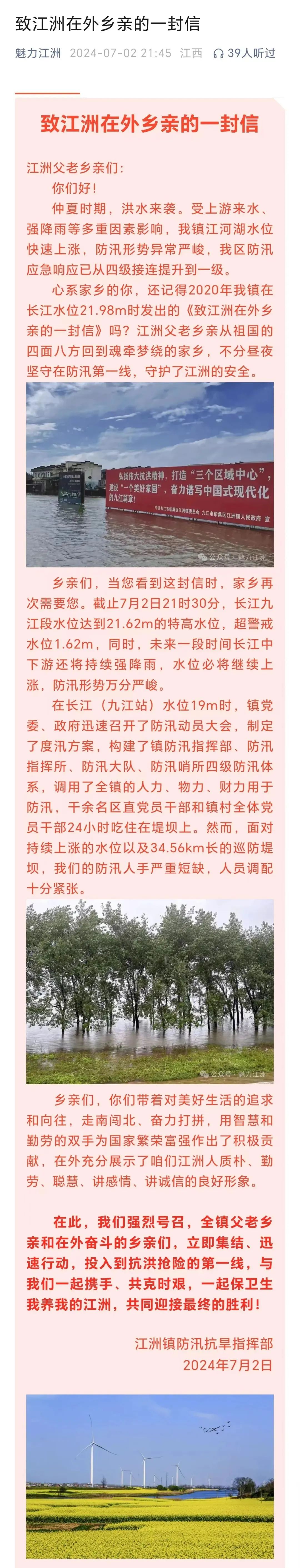 据“魅力江州”微信公众号消息,7月2日晚,江西省九江市柴桑区江洲镇防汛抗旱指挥部发布《致江洲在外乡亲的一封信》,信中提到,江洲镇防汛形势异常严峻,防汛应急响应已从四级接连提升到一级,防汛人手严重短缺,人员调配十分紧张,强烈号召全镇父老乡亲和在外奋斗的乡亲们,立即集结、迅速行动,投入到抗洪抢险的第一线。