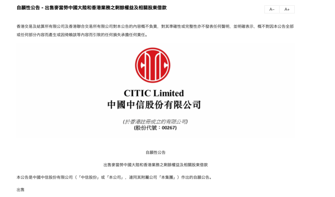 10月21日,中信资本宣布,旗下私募股权投资业务信宸资本与中信股份签订协议,收购其持有的麦当劳中国股份,交易后,中信资本联合体仍为麦当劳中国的控股股东。