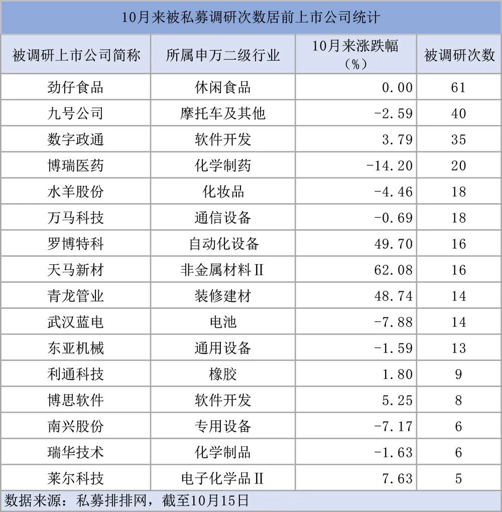据统计,在私募调研覆盖的27个申万二级行业中,休闲食品、软件开发、摩托车及其他、化学制药、通信设备等五个行业被调研的数量超过20次。与此同时,劲仔食品是10月以来私募调研数量最多的企业。