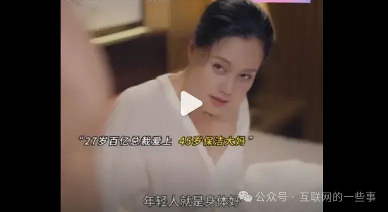 例如,近期爆火的短剧《保洁老妈无极归来》讲述了45岁的保洁阿姨与27岁霸道总裁一夜情缘,继而展开一系列波澜壮阔的爱情故事。