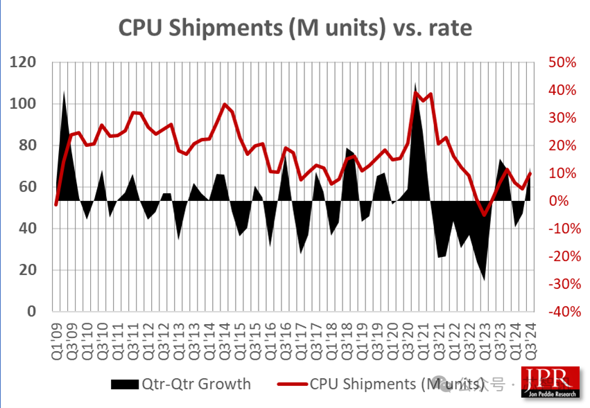 Jon Peddie Research指出,2024年三季度 iGPU 总出货量(包括所有客户端平台)比上一季度增长 7%,比去年同期增长 6%。