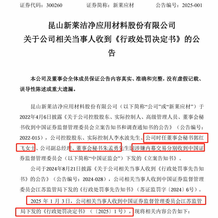 1月3日晚间,新莱应材(维权)公告,公司相关当事人收到《行政处罚决定书》,这也是2025年董秘的首份罚单了,此次被罚是因为相关当事人涉嫌内幕交易公司股票,一共5人被处罚,其中有2人是时任董秘和证代,是不是有点匪夷所思,董秘和证代内幕交易自家公司股票?