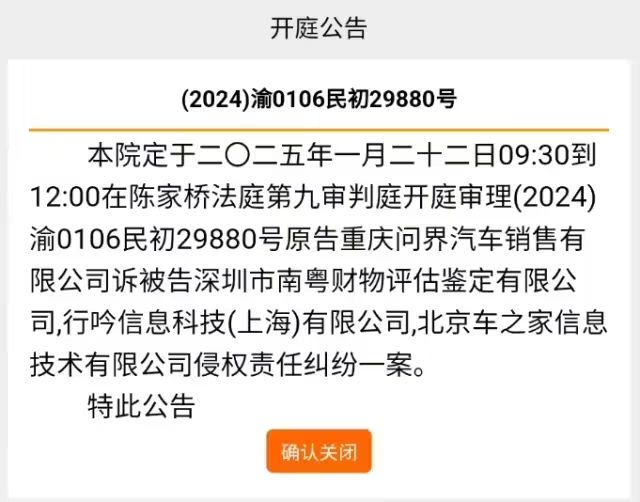1月3日,重庆法院公众服务网显示,重庆问界汽车销售有限公司,与深圳市南粤财物评估鉴定有限公司、行吟信息科技(上海)有限公司、北京车之家信息技术有限公司,相关侵权责任纠纷案件新增开庭公告。
