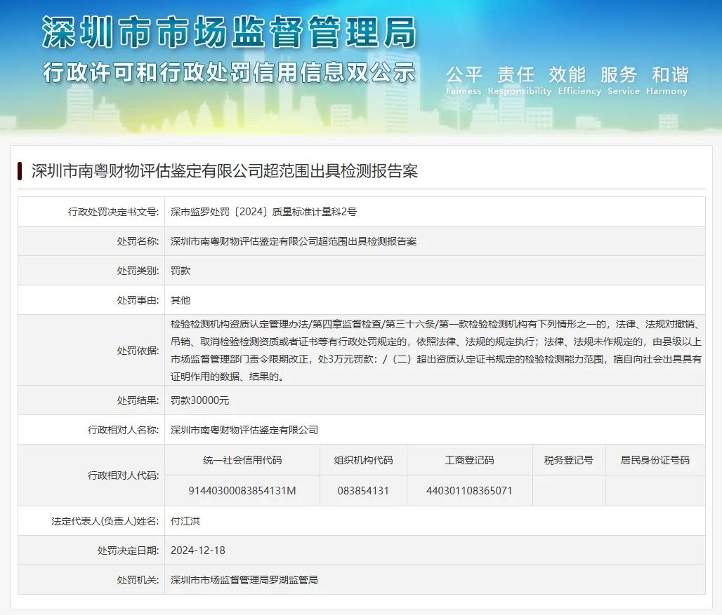 值得注意的是,2024年12月18日,南粤评估遭到深圳市市场监督管理局行政处罚。