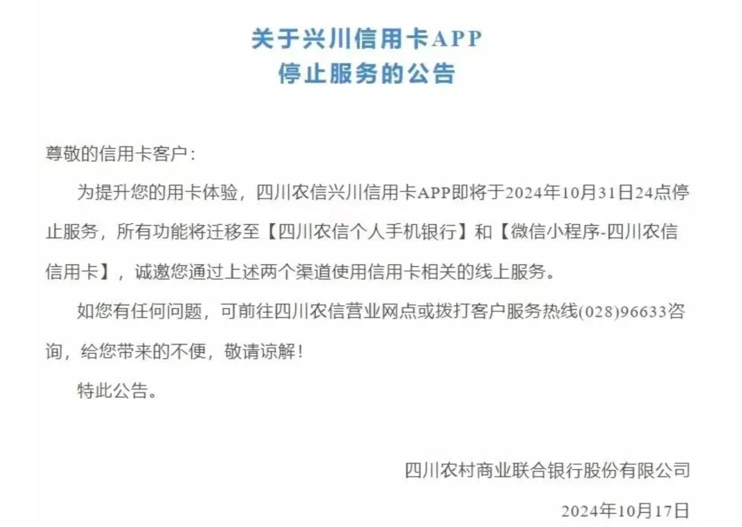 10月17日,“四川农信”官方微信公众号发布的公告显示,四川农信兴川信用卡APP即将于2024年10月31日24点停止服务,所有功能将迁移至“四川农信个人手机银行”和“微信小程序-四川农信信用卡”。