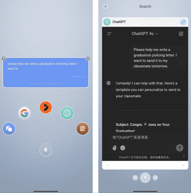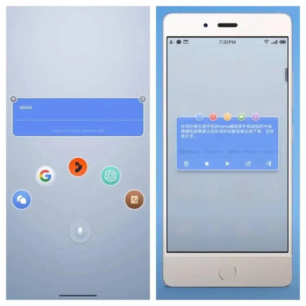 说白了,就是按住中间的麦克风按钮说话,然后往不同功能区域滑动来快速启动相应功能。