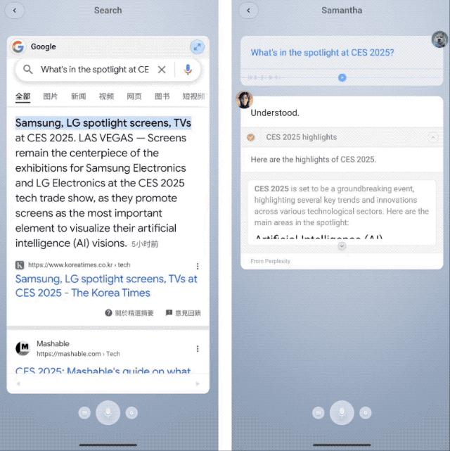 以用语音搜索“CES 2025有哪些亮点”为例,Google的搜索会直接跳转网页,一步到位锁定关键词,而若是交给内置的自家模型Jarvis功能,它还会整理分析好的结果,并罗列出来。