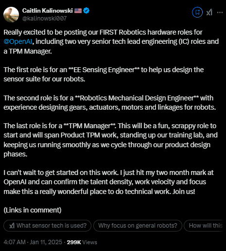 在帖子中,Kalinowski重点介绍了OpenAI机器人团队的三个岗位以及负责的具体内容,包括电子感知工程师、机器人机械设计工程师、技术项目经理。