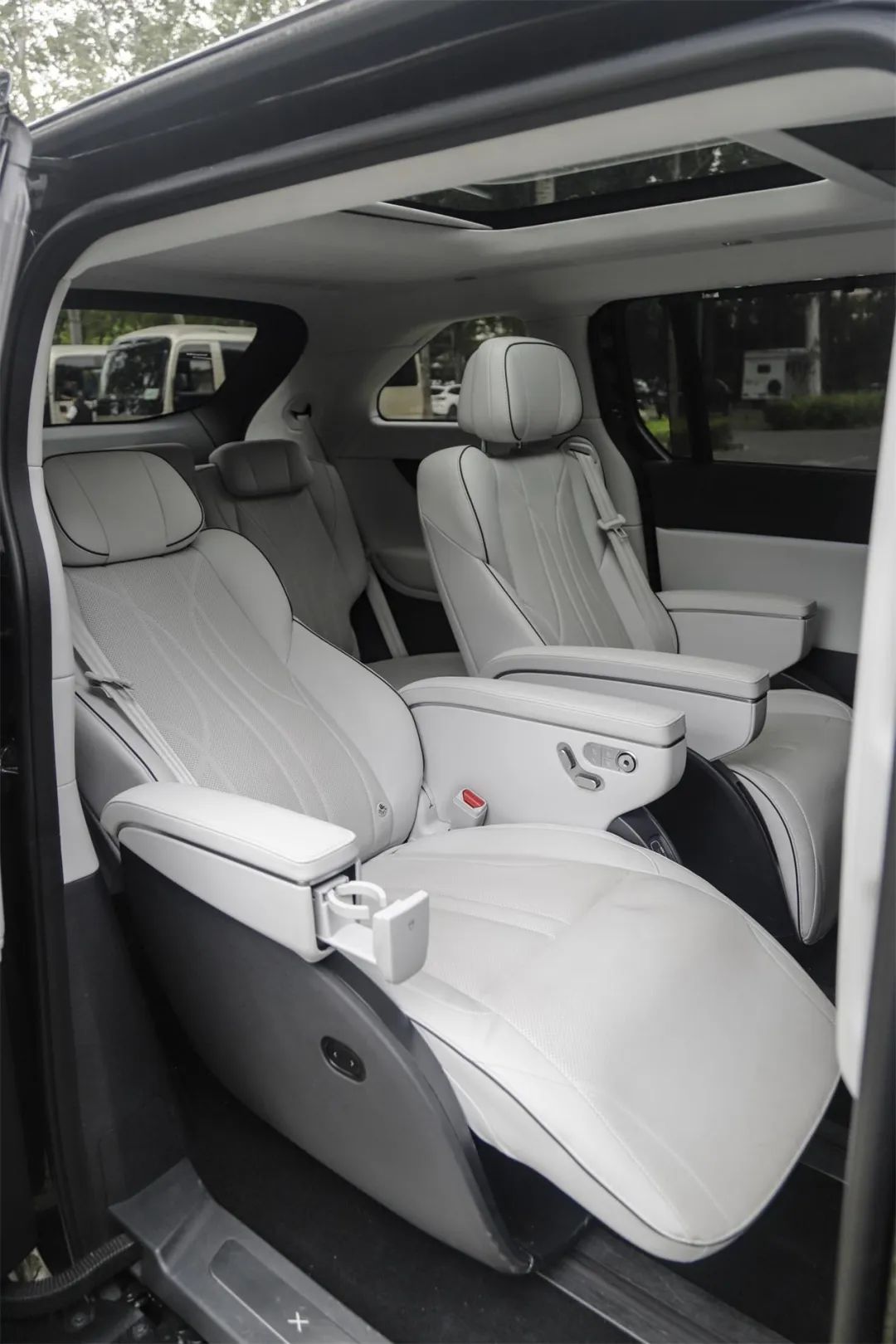 配置的思路似乎回到了一台中规中矩的 MPV。主驾的座椅配置比较齐全,但副驾缺少座椅按摩有点不应该,而且没有副驾屏,更别说讨好 “女王” 的化妆镜这些细节了。加分项是雨伞槽,以前只在劳斯莱斯上见到过这种设计。不过要用钥匙才能撬开是为什么呢?里面就不能配好专属的雨伞吗?我加钱都行。同事的疑问的确有道理。