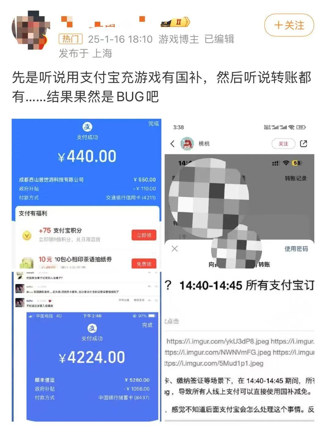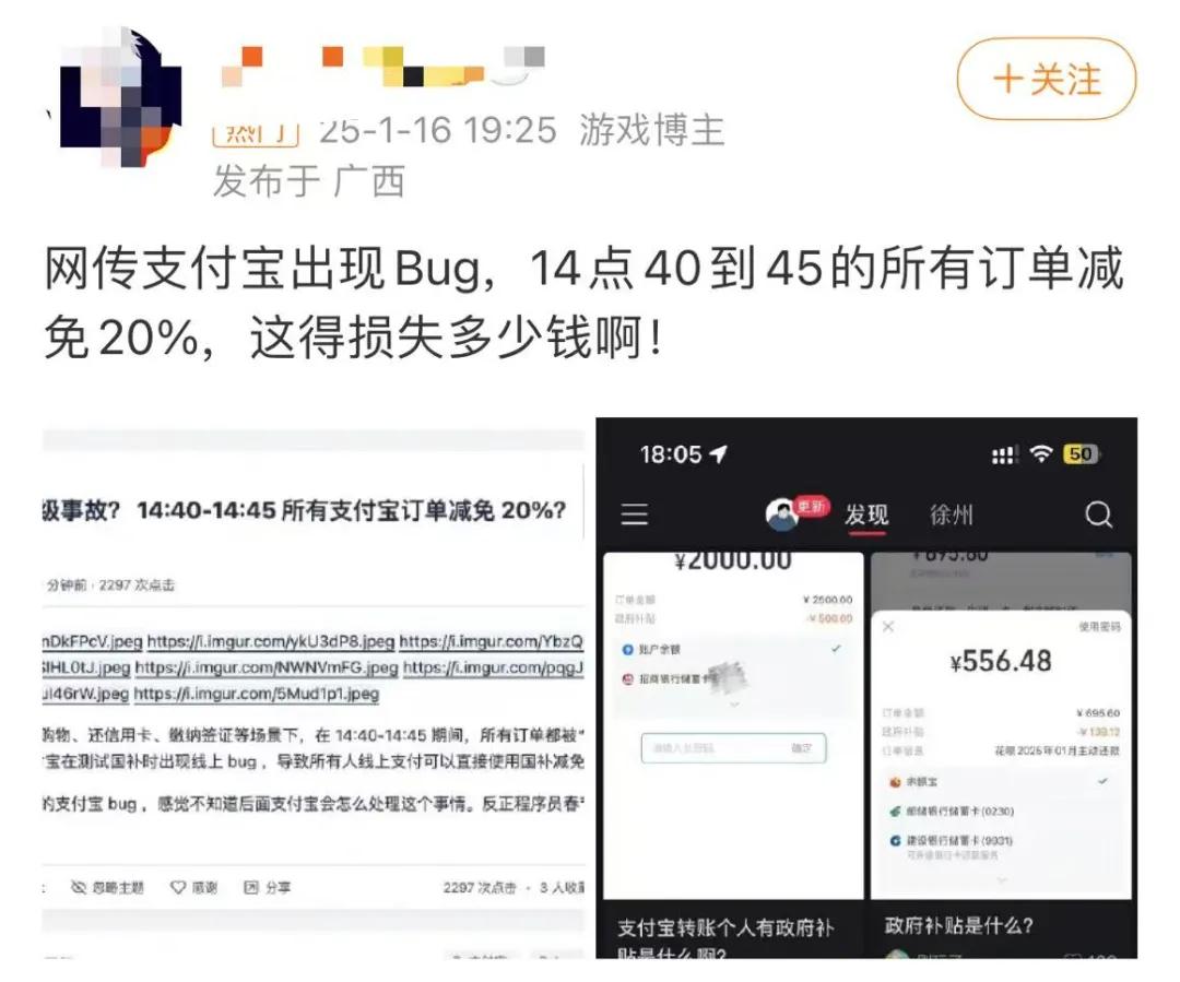 1月16日下午起,多名网友在社交平台上反映支付宝出现bug,所有订单优惠20%,包括个人转账、购票、还信用卡、缴纳房租等。