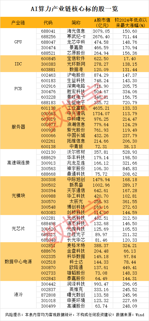A股市场上,涉及AI算力产业链的上市公司众多,证券时报·数据宝以上市公司公告、互动回答、券商研报等为基础,从中梳理出AI算力核心标的股,合计51只股票入围。