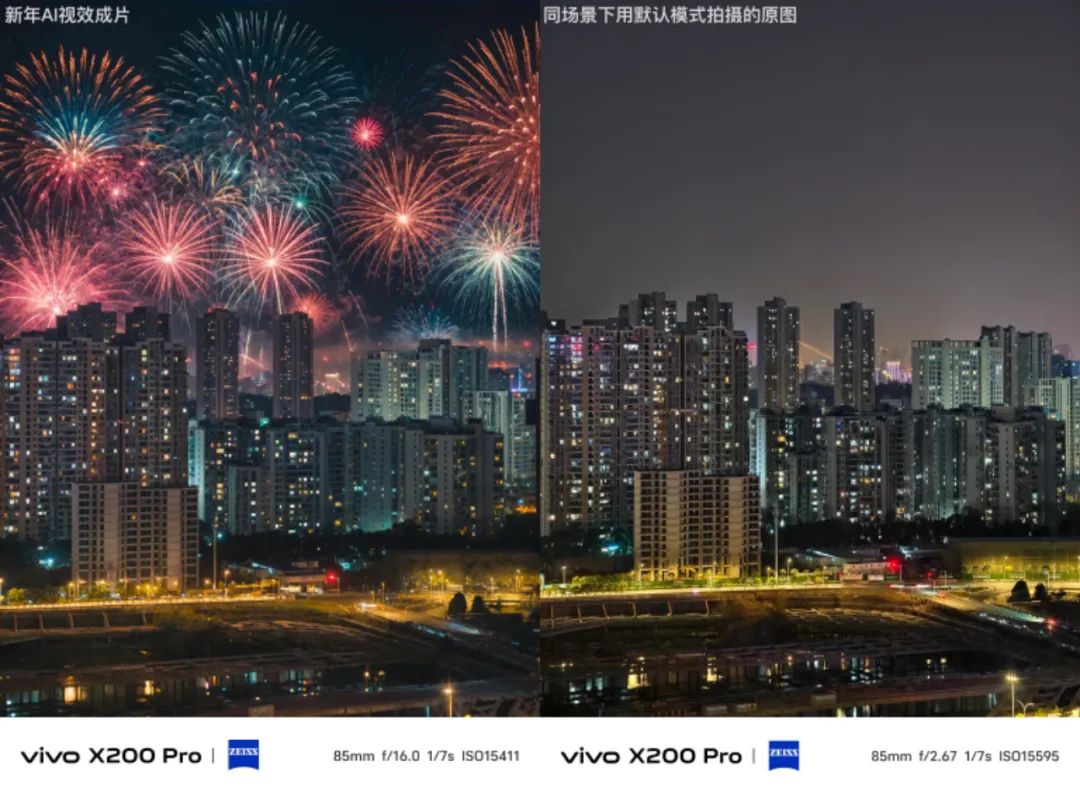 如上图所见,左侧是新年AI视效成片,右侧是在同一个地方使用手机默认设置拍摄的窗外夜景,用“新年AI视效”拍摄的夜景天空中会自动随机生成不同密度的烟花,仿佛真的有一场盛大的烟花。不过有时候AI太猛、烟花太密就显得有些假了。