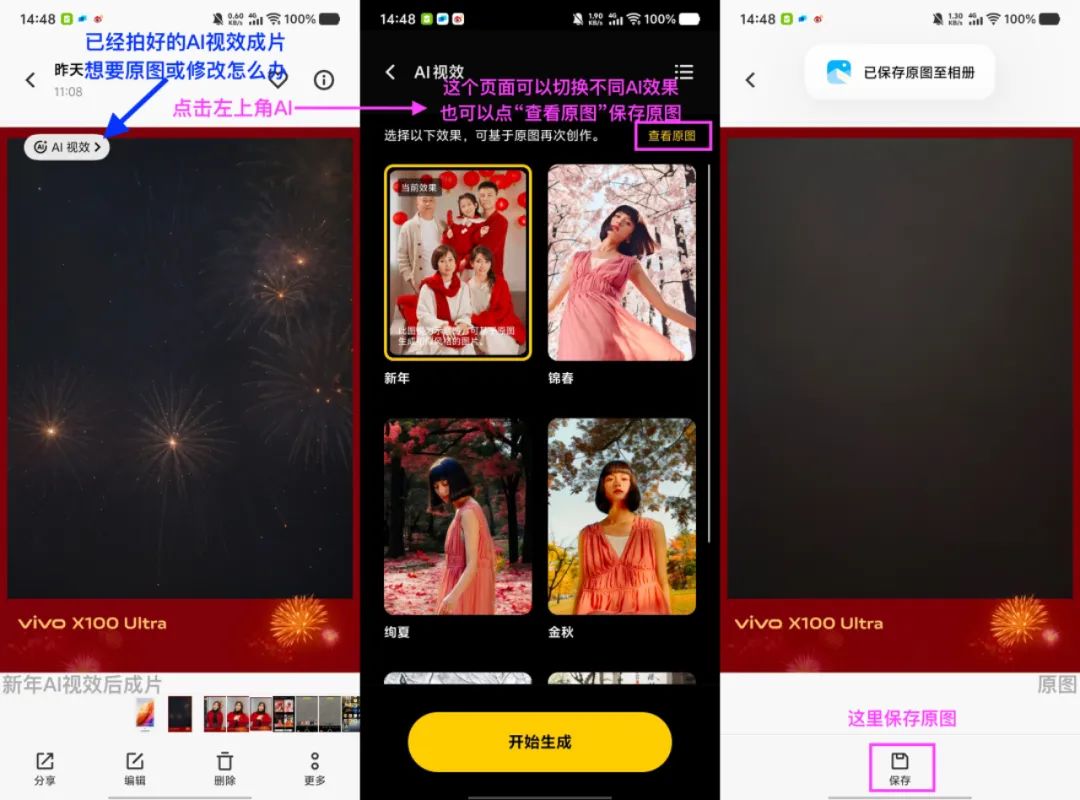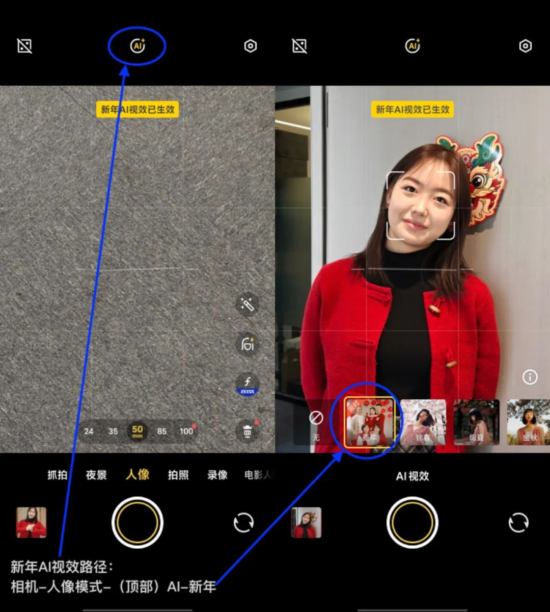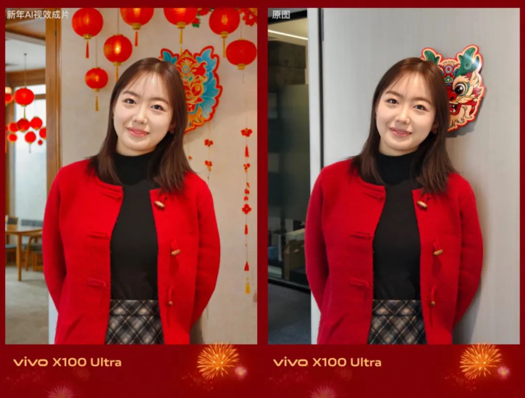 如上图所见,将手机更新到最新系统版本后,打开相机-切换人像模式-点击顶部的AI选择第一个“新年AI视效”功能,一张平平无奇的照片背景就会自动变成含有新春元素的背景;拍摄多人合影比如全家福,背景也会生成类似效果(每次效果随机)。