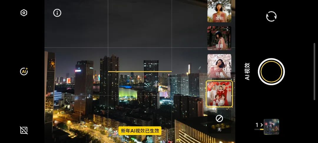 如果把镜头捂住假装是拍摄黑漆漆的天空、这时候打开“新年AI视效”,同样可以得到一张随机生成的电子烟花照片,这里的成片烟花看起来就相对自然些。细节上,需要注意的是,使用“新年AI视效”功能需要联网,生成后就是效果图,如果想要原图或者切换其它AI效果图,则需要在相册打开那张成片-点击左上角AI视效-再查看原图保存。